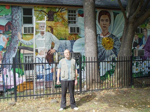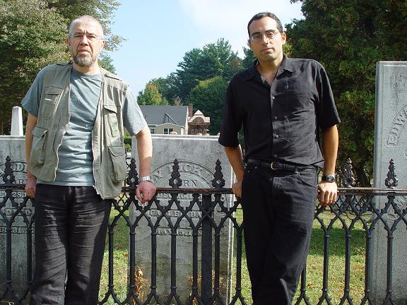 Gandlevsky at cemetery in Amherst, with Robert Frost and Emily Dickinson kitsch