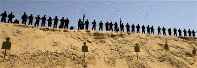 Palestinian militants from Islamic Jihad take part in a training session in the evacuated Jewish settlement of Netzarim, south of Gaza City, Tuesday, April 24, 2007. Hamas militants fired a barrage of rockets and mortar shells toward Israel on Tuesday and said they considered a five-month truce with Israel to have come to an end. (AP Photo/ Hatem Moussa)