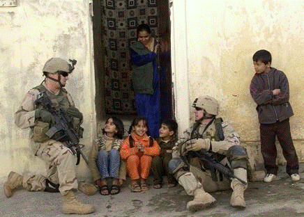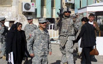 American soldiers in Sulaymaniyeh, northern Iraq, face little hostility from civilians. Nardin Baban, a Kurdish-American translator (foreground, without rifle), helps the other soldiers communicate with civilians. -Truth Digg Magazine Dec. 2006