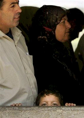 A young child peers over a barrier as Palestinians wait to cross the Hawara checkpoint near the West Bank city of Nablus, Tuesday, April 24, 2007. Israel imposed a full closure on the West Bank and Gaza Strip as the nation marks its annual Independence Day Tuesday. (AP Photo/Muhammed Muheisen)