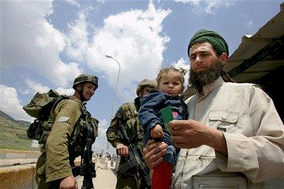A Palestinian man holds his daughter as Israeli soldiers watch whilst he crosses the Hawara checkpoint near the West Bank city of Nablus, Tuesday, April 24, 2007. Israel imposed a full closure on the West Bank and Gaza Strip as the nation marks its annual Independence Day on Tuesday. (AP Photo/Muhammed Muheisen)