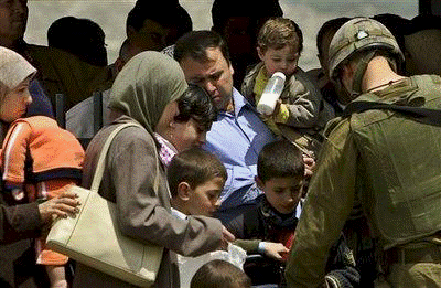 An Israeli soldier checks a Palestinian family as they wait to cross Hawara checkpoint near the West Bank city of Nablus, Tuesday, April 24, 2007. Israel imposed a full closure on the West Bank and Gaza Strip as the nation marks its annual Independence Day on Tuesday. (AP Photo/Muhammed Muheisen)