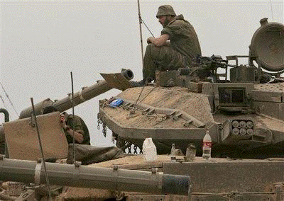 4/25/2007, 8:00 p.m. EDT Israeli soldiers sit atop tank next to the border between Israel and the Gaza Strip, Thursday, April 26, 2007. Palestinian militants in the Gaza Strip fired two rockets toward Israel on Thursday, the army said, further threatening a cease-fire strained by several days of fighting. Israeli Prime Minister Ehud Olmert on Wednesday ruled out a large-scale invasion of Gaza in response to a barrage of rockets fired by the Hamas militant group earlier in the week, giving a chance for the 5-month-old truce to take hold again. (AP Photo / Tsafrir Abayov)